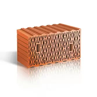 Имеет лучший показатель по теплопроводности в условиях эксплуатации в сравнении с альтернативными крупноформатными поризованными камнями. В качестве доборного элемента применяется камень 10,7NF. Экономические преимущества по сравнению с камнем 14,3NF – снижение толщины стены, снижение веса конструкции, сокращение расхода раствора.